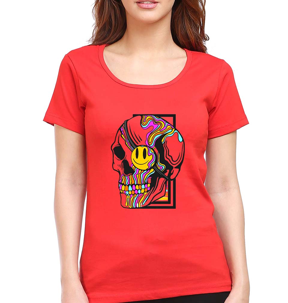 Trippy Psychedelic Skull Emoji T-Shirt for Women-Red-Ektarfa.online